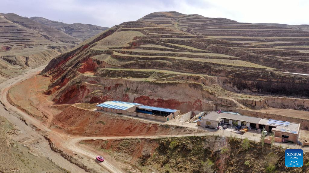 This aerial photo taken on April 18, 2023 shows veterinarian Bai Hua driving her pink car on her way to a farmer's house for treating cattle in Guyuan, northwest China's Ningxia Hui Autonomous Region. (Xinhua/Feng Kaihua)