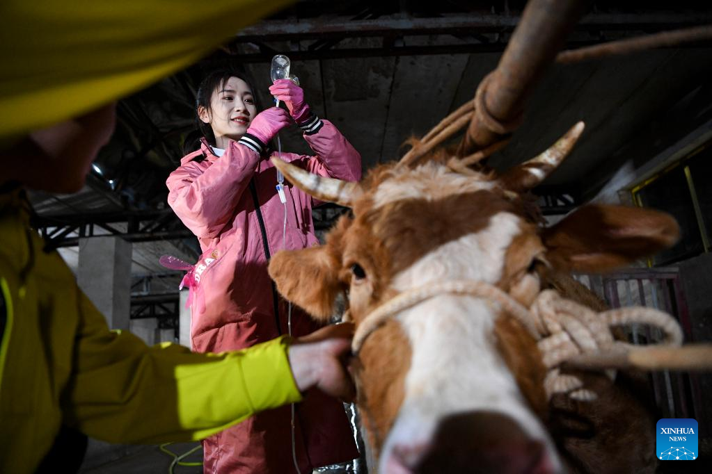 Veterinarian Bai Hua gives infusion to a cow owned by a farmer in Yuanzhou District, Guyuan, northwest China's Ningxia Hui Autonomous Region, April 17, 2023. (Xinhua/Feng Kaihua)