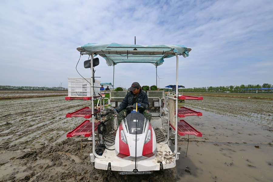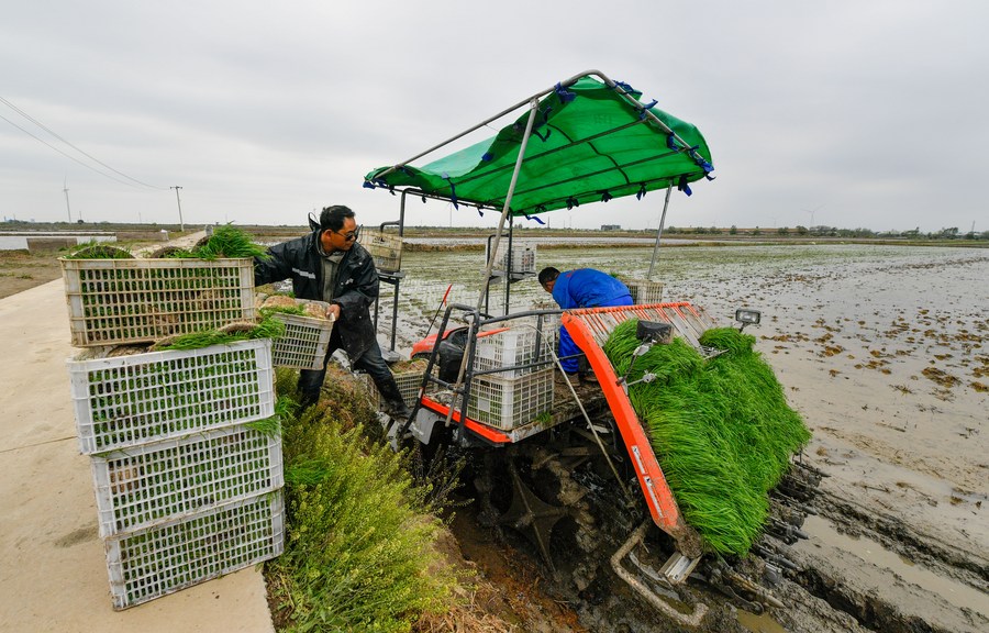 Farmers load rice seedlings onto a transplanter at an agricultural products development and demonstration center in north China's Tianjin, May 5, 2023. (Xinhua/Sun Fanyue)