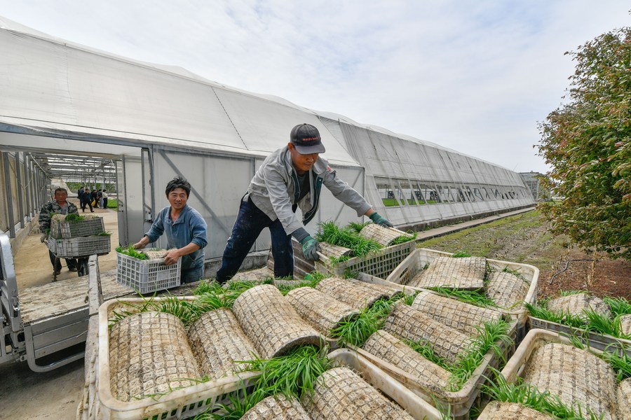 Rice seedlings are loaded onto a vehicle at an agricultural products development and demonstration center in north China's Tianjin, May 5, 2023. (Xinhua/Sun Fanyue)