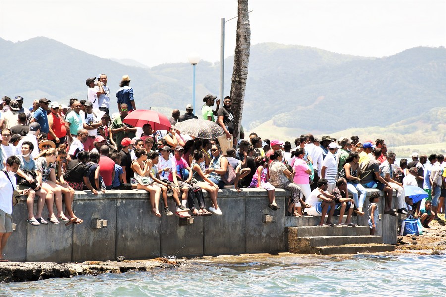 Spectators watch a race aboard local canoes during the Mauritian Language and Culture Festival in Mahebourg, Mauritius, Dec. 12, 2020. (Xinhua/Ajai Daby)