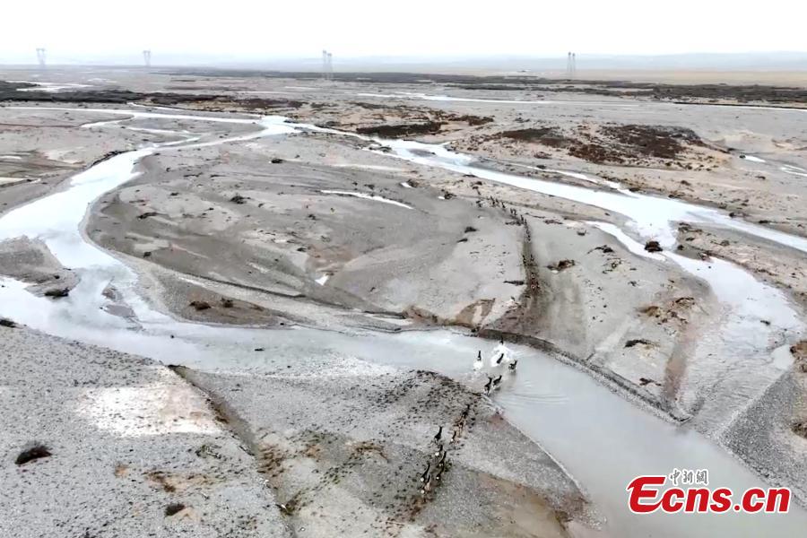 A herd of red deer cross the Buha River in Gangcha County of Haibei Tibetan Autonomous Prefecture, northwest China's Qinghai Province. (Photo/China News Service)