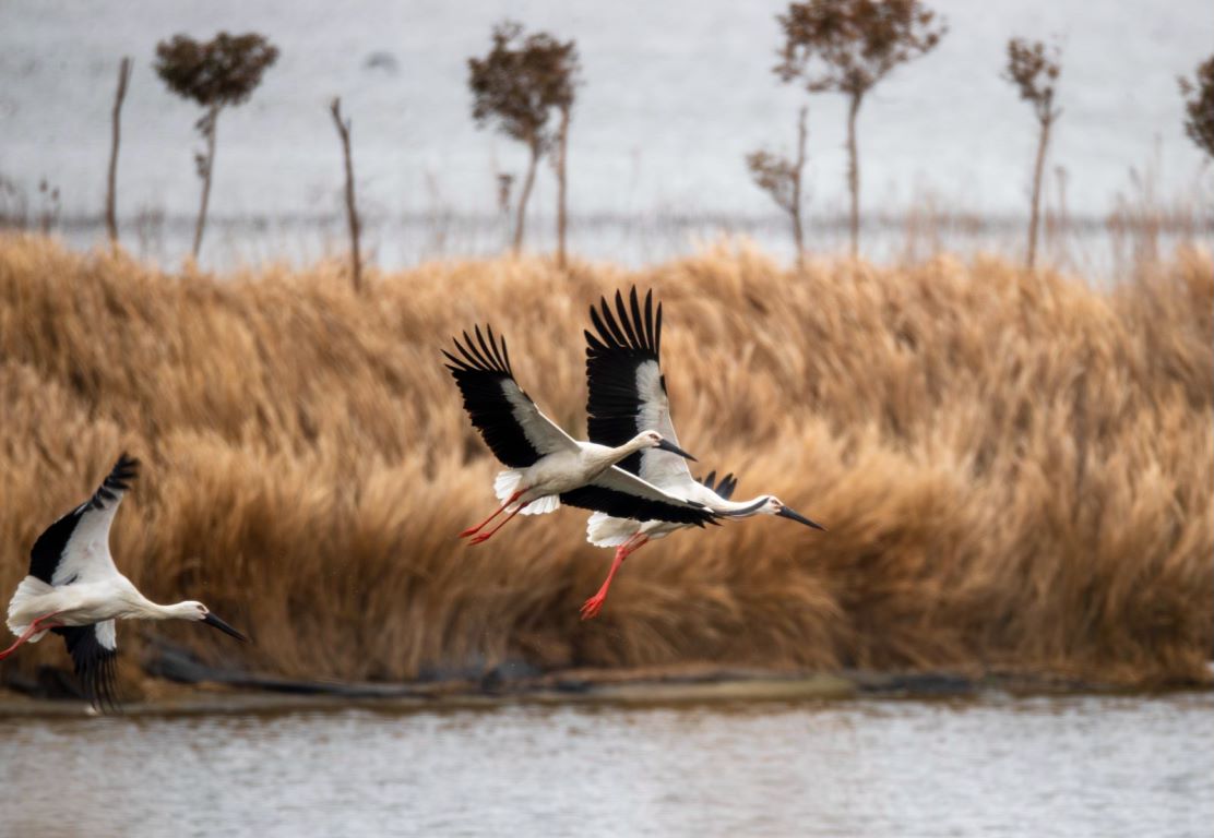 Birds fly over at the Tiaozini wetland, in Feb 2023. [Photo by Sun Jialu/for chinadaily.com.cn]