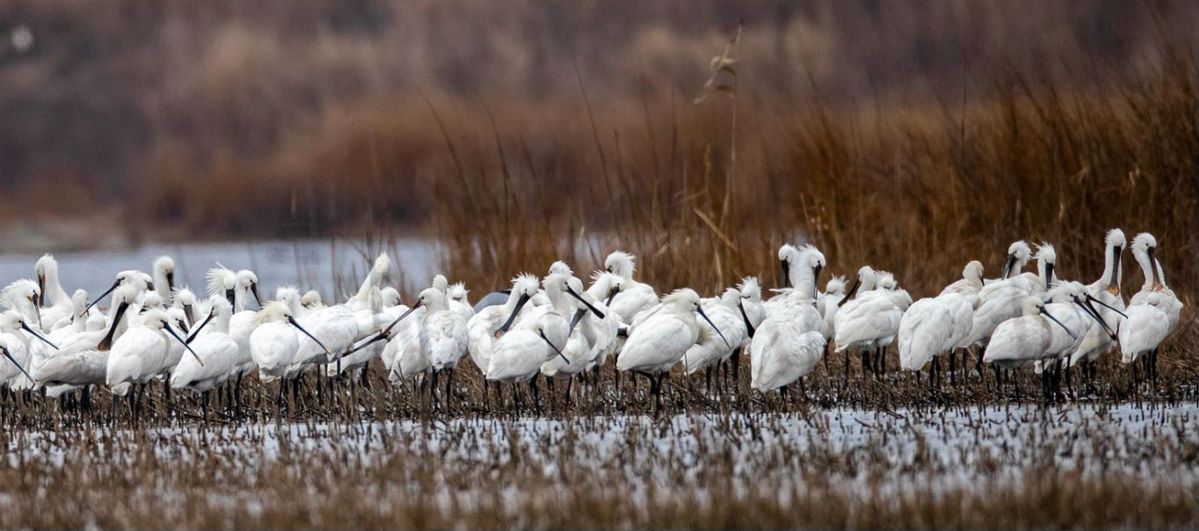 Flocks of wading birds gather at Tiaozini wetland in Dongtai city, Yancheng city, East China's Jiangsu province, in Feb 2023. [Photo by Sun Jialu/for chinadaily.com.cn]