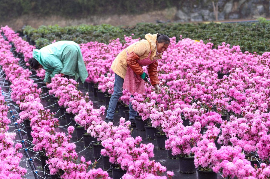 Farmers trim flowers at a flower cultivation base in Bailidujuan administrative area in Bijie, southwest China's Guizhou Province, March 28, 2023. (Photo by Yao Lei/Xinhua)