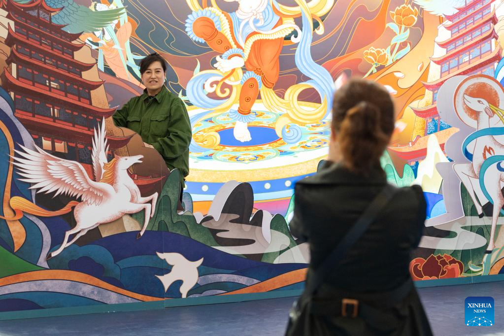 A visitor poses for photos at the Northeast Asia Art & Design Expo in Harbin, northeast China's Heilongjiang Province, May 7, 2023. The Northeast Asia Art & Design Expo kicked off here on Sunday and will last till May 10. (Xinhua/Xie Jianfei)
