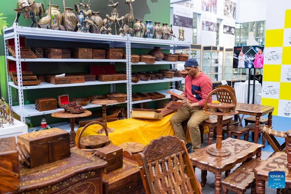A foreign exhibitor arranges products at the Northeast Asia Art & Design Expo in Harbin, northeast China's Heilongjiang Province, May 7, 2023. The Northeast Asia Art & Design Expo kicked off here on Sunday and will last till May 10. (Xinhua/Xie Jianfei)