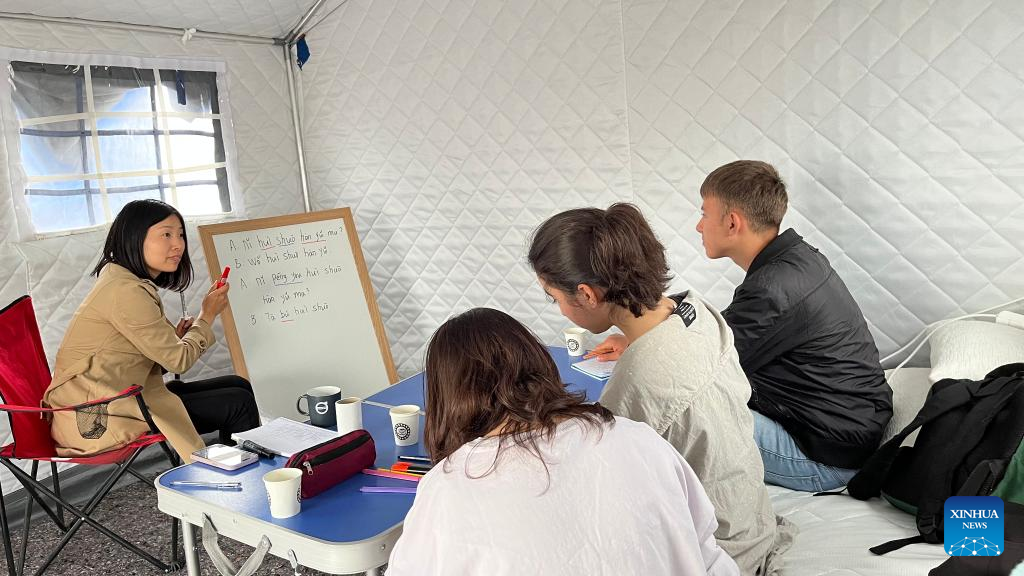 A Chinese volunteer teaches Chinese in the Chinese tent village in Kahramanmaras, Türkiye on May 6, 2023.(Photo by Fang Mingdao/Xinhua)