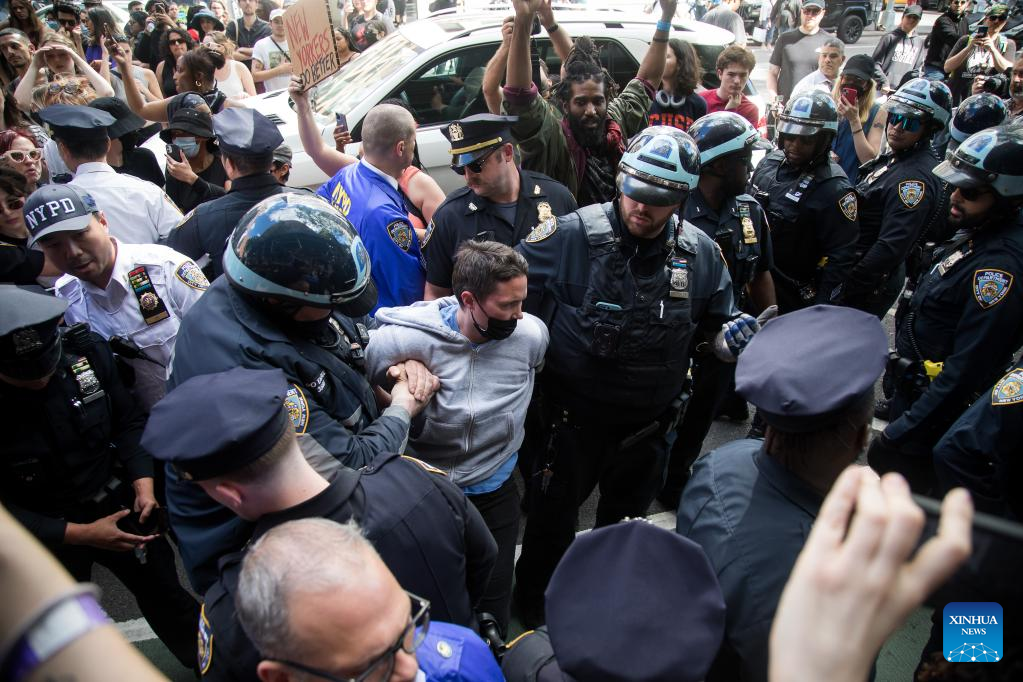 Police officers arrest a protester during a protest over chokehold death of a black man in New York, the United States, May 6, 2023. (Photo by Michael Nagle/Xinhua)