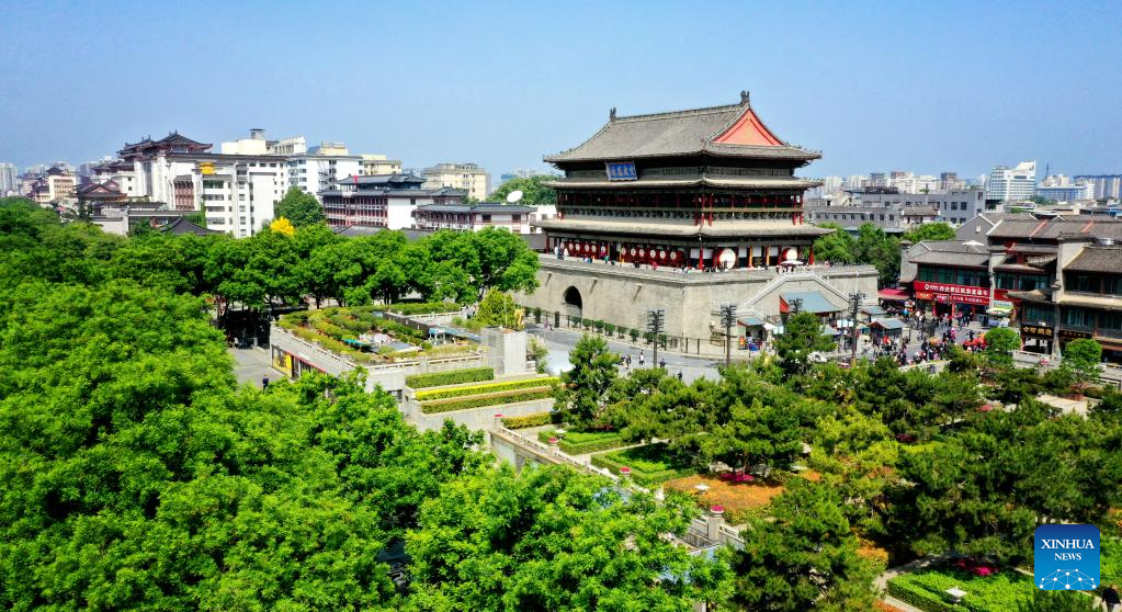 This aerial photo taken on April 25, 2023 shows a view of the Drum Tower in Xi'an, northwest China's Shaanxi Province. (Xinhua/Liu Xiao)
