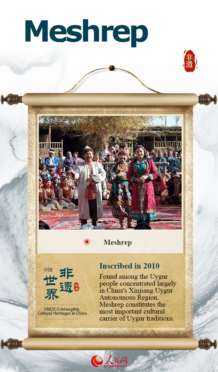 Uygur muqam is the most comprehensive art form included in the event, integrating song, dance and entertainment. Meshrep functions both as a 'court', where the host mediates conflicts and ensures the preservation of moral standards, and as a 'classroom', where people can learn about their traditional customs.