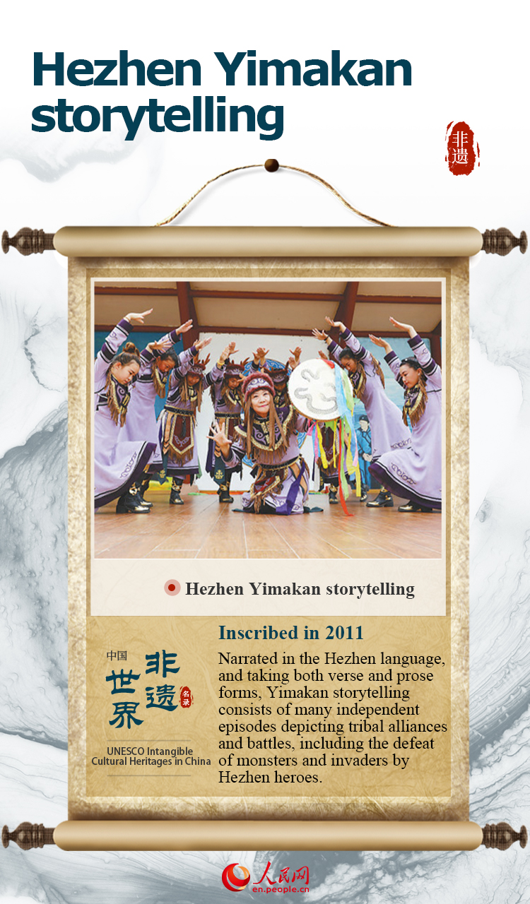 The item, "Hezhen Yimakan storytelling" was inscribed on UNESCO's List of Intangible Cultural Heritage in Need of Urgent Safeguarding in 2011.
