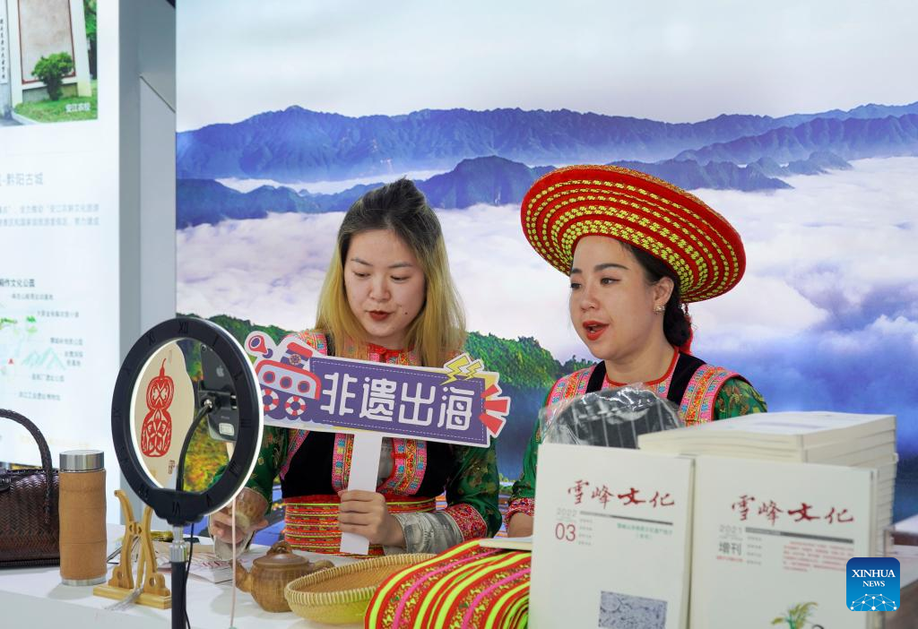 Staff members promote products of intangible cultural heritage via livestreaming during the First Hunan (Huaihua) RCEP Economic and Trade Expo in Huaihua City, central China's Hunan Province, May 5, 2023.(Xinhua/Yu Chunsheng)