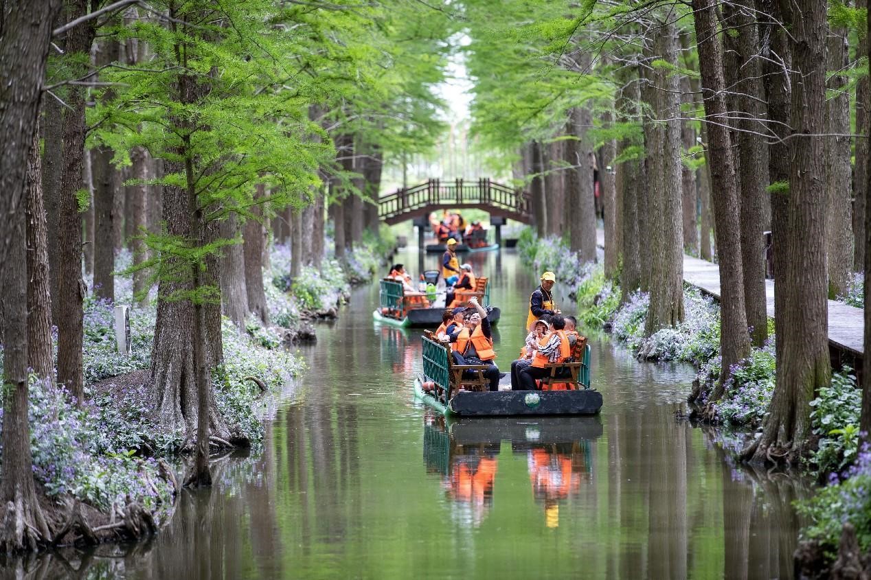 Tourists are boating in a national wetland park in east China's Jiangsu province, April 29, 2023. (People's Daily Online/Zhou Shegen)