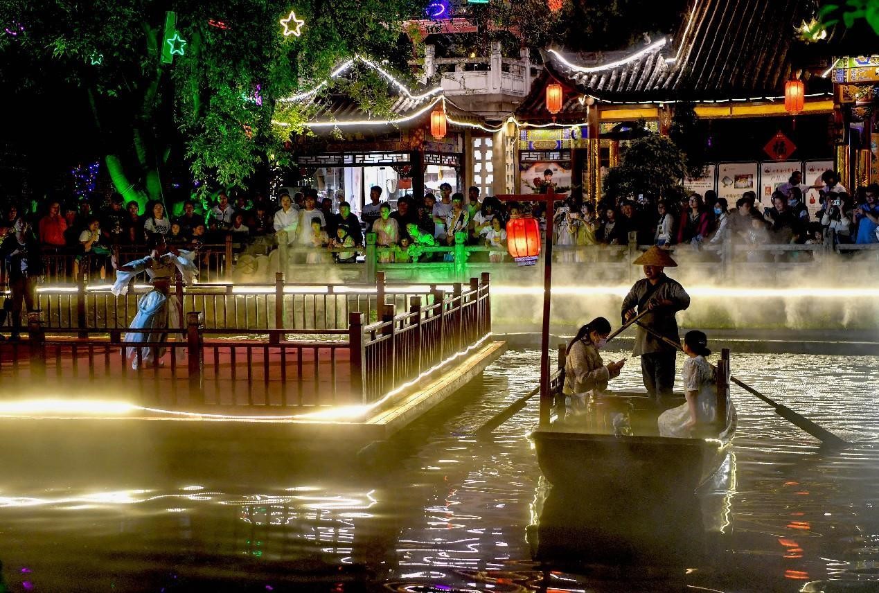 At the Liangjiang International Film City, a tourist attraction in southwest China's Chongqing municipality, a live-action performance was staged at night during the holiday. Tourists were wandering there in traditional costumes to experience the charm of the local culture.