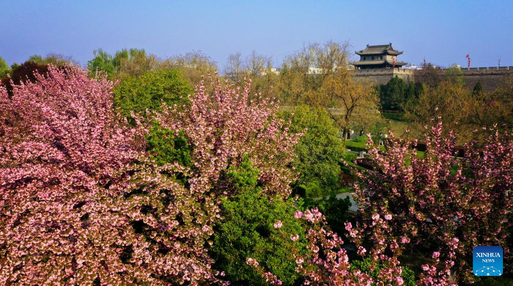 This aerial photo taken on April 1, 2023 shows the scenery of the ancient city wall with blooming flowers in Xi'an, northwest China's Shaanxi Province. (Xinhua/Liu Xiao)