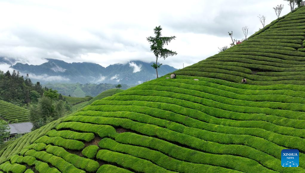 This aerial photo taken on May 7, 2023 shows a tea garden in Zouma Township, Hefeng County, central China's Hubei Province. In recent years, Hefeng County has explored the integration of tea industry with tourism and built a number of tea gardens, which help increase local farmers' income and promote rural revitalization. (Photo by Yang Shunpi/Xinhua)