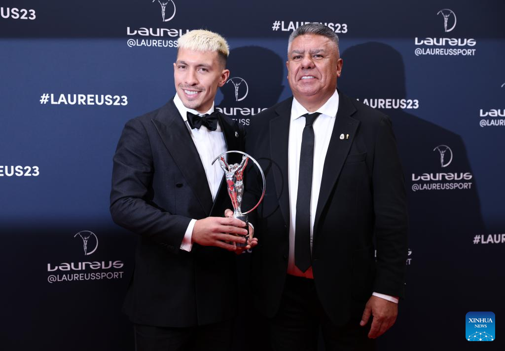 Argentine football defender Lisandro Martinez (L) and President of the Argentine Football Association Claudio Tapia pose with the trophy of Laureus World Team of the Year award for Argentina men's football team at the 2023 Laureus World Sports Awards ceremony in Paris France, May 8, 2023. (Xinhua/Gao Jing)