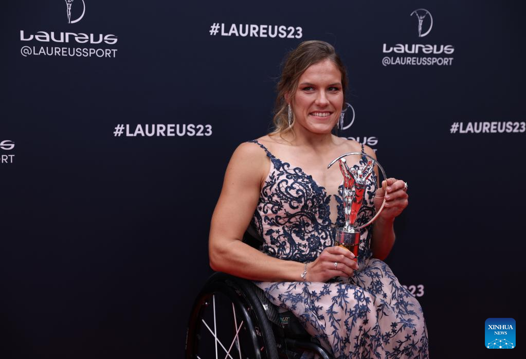 Swiss para-athlete Catherine Debrunner poses with Laureus World Sportsperson of the Year with a Disability award at the 2023 Laureus World Sports Awards ceremony in Paris France, May 8, 2023. (Xinhua/Gao Jing)
