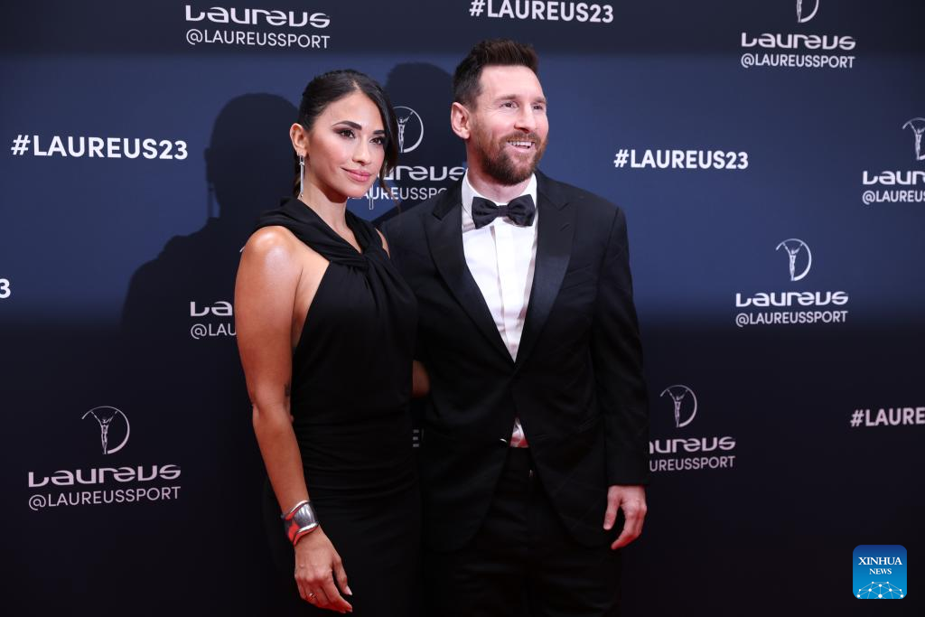 Argentinian football player Lionel Messi (R) and his wife Antonela Roccuzzo are seen on the red carpet prior to the 2023 Laureus World Sports Awards ceremony in Paris, France, May 8, 2023. (Xinhua/Gao Jing)