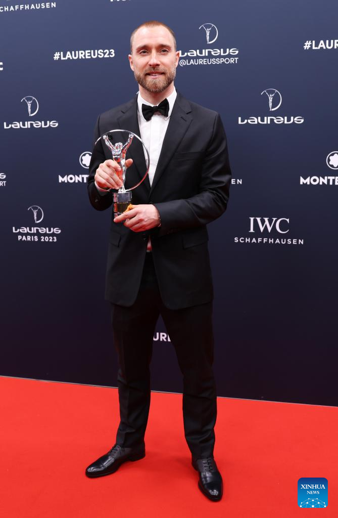 The Laureus World Comeback of the Year award winner Danish football player Christian Eriksen poses with the trophy at the 2023 Laureus World Sports Awards ceremony in Paris France, May 8, 2023. (Xinhua/Gao Jing)