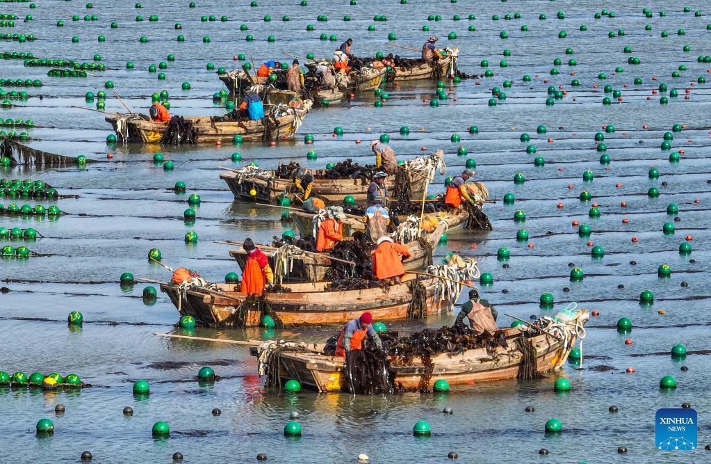This aerial photo shows fishermen harvesting kelp in Rongcheng, east China's Shandong Province, May 8, 2023. (Photo by Li Xinjun/Xinhua)