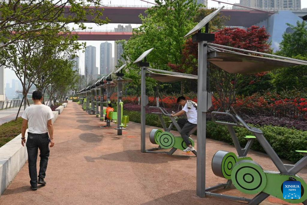 This photo taken on April 14, 2023 shows newly built intelligent work-out facilities in Jiulongpo District, southwest China's Chongqing Municipality. (Xinhua/Zhao Jiale)