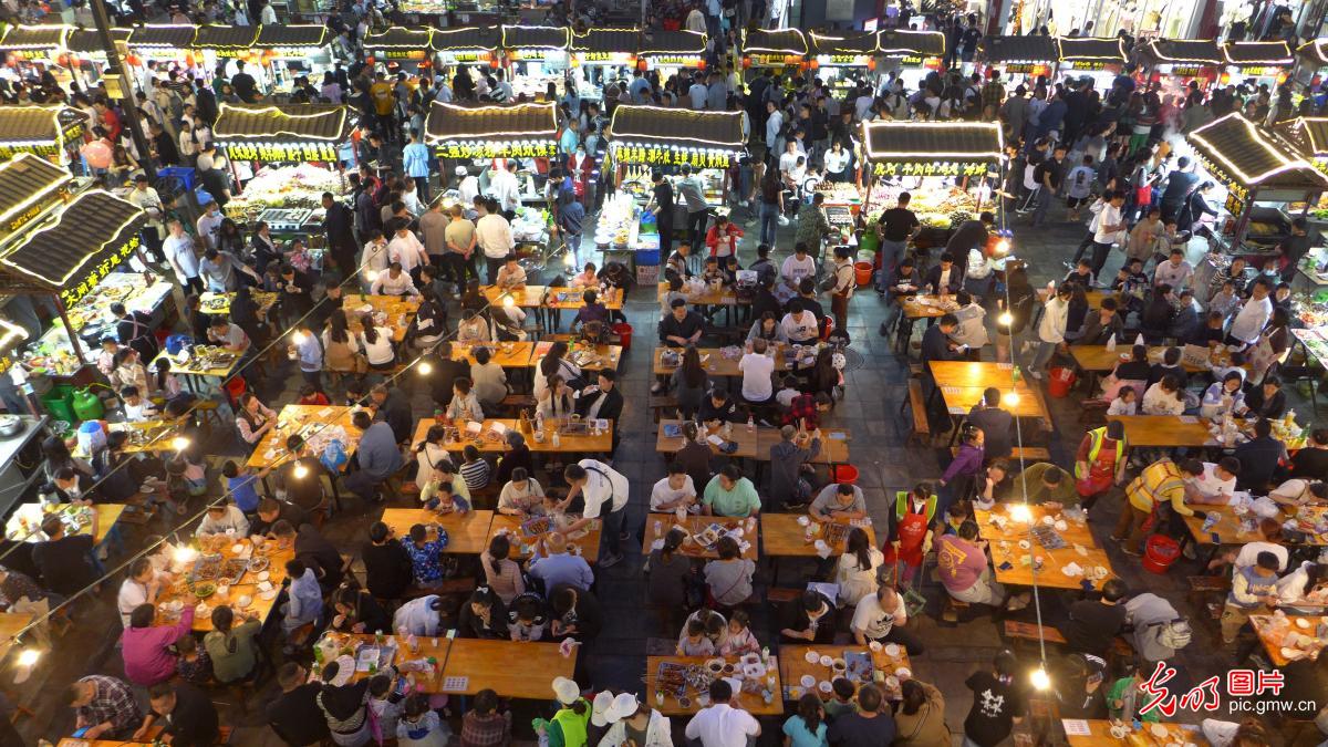People enjoy food at a night market in Kaifeng, central China’s Henan Province, April 30, 2023. (Gmw.cn/Li Junsheng)