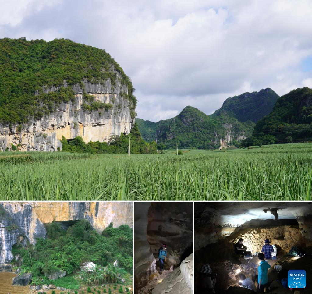 This undated combo photo shows Yanlidong, a cave site in south China's Guangxi Zhuang Autonomous Region. (Anthropology Museum of Guangxi/Handout via Xinhua)