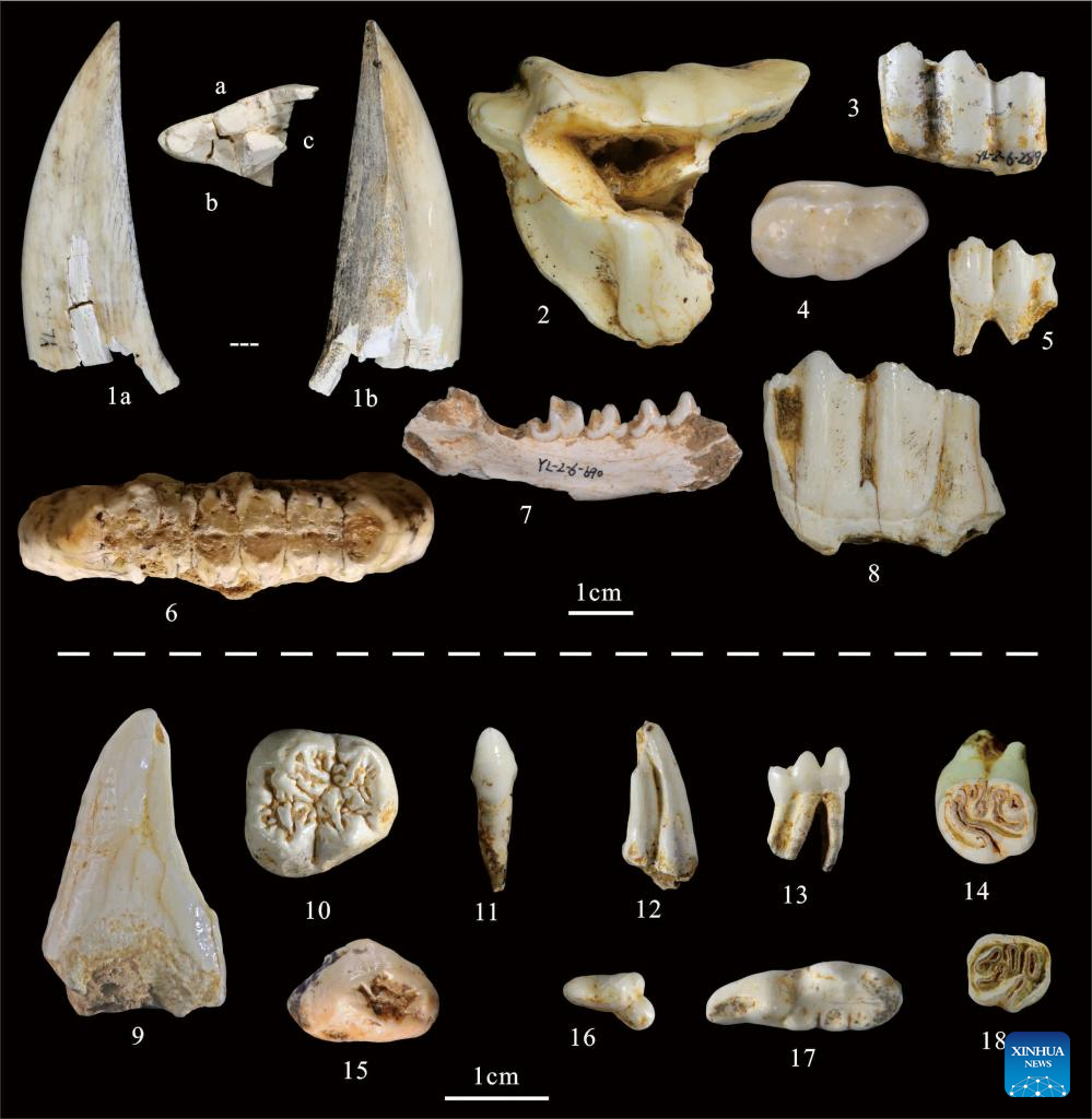 This undated image shows mammalian tooth fossils unearthed at Yanlidong, a cave site in south China's Guangxi Zhuang Autonomous Region. (Anthropology Museum of Guangxi/Handout via Xinhua)
