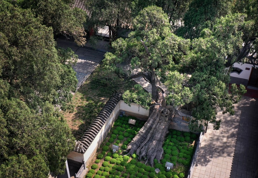 Aerial photo taken on April 7, 2022 shows a cypress tree in the Songyang Academy in Dengfeng, central China's Henan Province. (Xinhua/Li An)