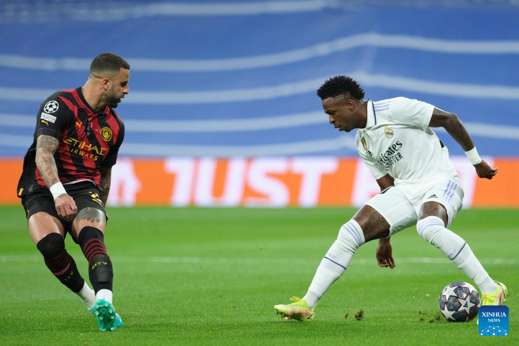 Vinicius Jr. (R) of Real Madrid vies with Kyle Walker of Manchester City during the UEFA Champions League semifinal first Leg match in Madrid, Spain, on May 9, 2023. (Xinhua/Meng Dingbo)