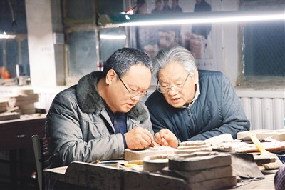 Lin Yongmao (right) and his son Lin Tao make a Chengni inkstone. (Photo courtesy of the interviewee)