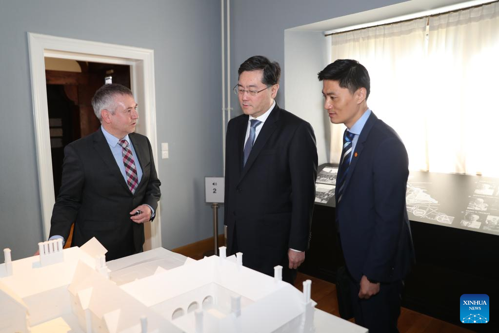 Chinese State Councilor and Foreign Minister Qin Gang (C) visits the historic site of the Potsdam Conference and delivers a speech in Germany, May 10, 2023. (Xinhua/Du Zheyu)