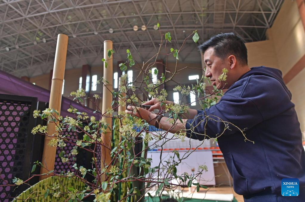 A staff member makes preparations for flower arrangement artworks at the Liaoning Agricultural Technical College in Shenyang, northeast China's Liaoning Province, May 10, 2023. Teachers and professionals in gardening and floriculture presented flower arrangement artworks at the Liaoning Agricultural Technical College on Wednesday. (Xinhua/Yang Qing)