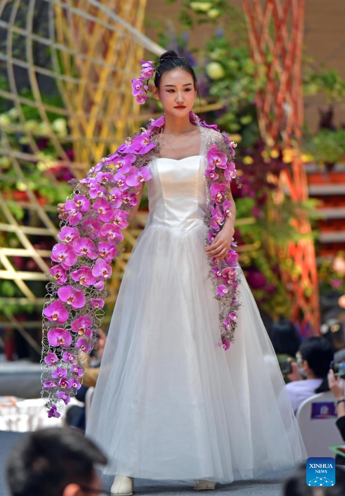 A student from the Liaoning Agricultural Technical College demonstrates flower arrangement artworks in Shenyang, northeast China's Liaoning Province, May 10, 2023. Teachers and professionals in gardening and floriculture presented flower arrangement artworks at the Liaoning Agricultural Technical College on Wednesday. (Xinhua/Yang Qing)