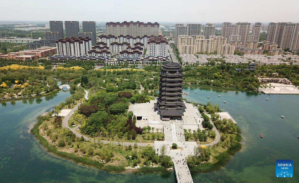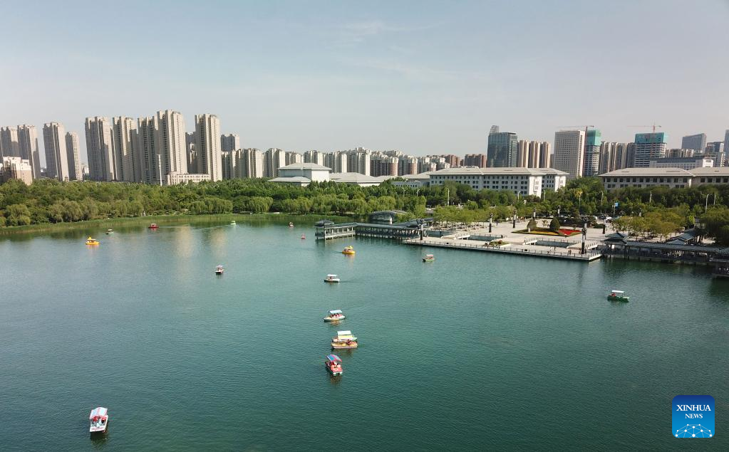 This aerial photo taken on May 8, 2023 shows a view of Taigong Lake park in Linzi District of Zibo, east China's Shandong Province. (Xinhua/Zhu Zheng)