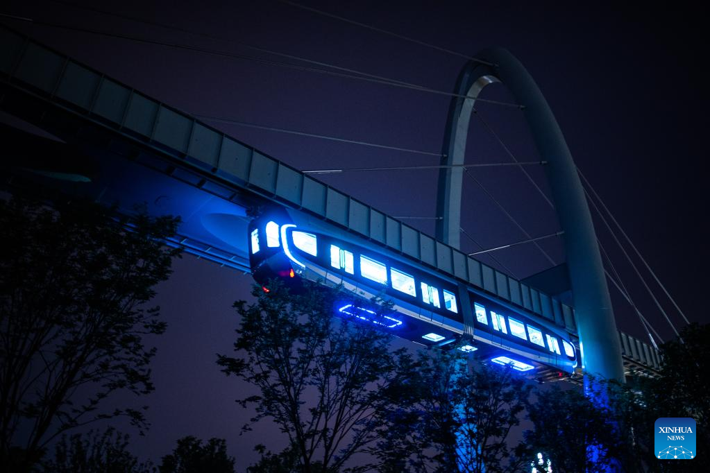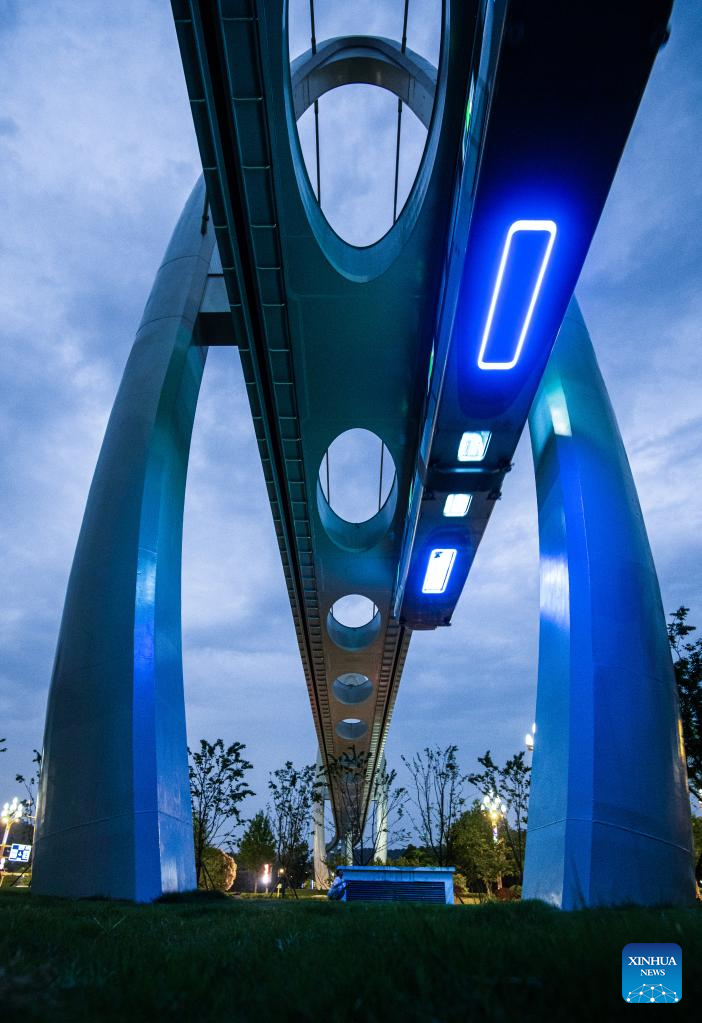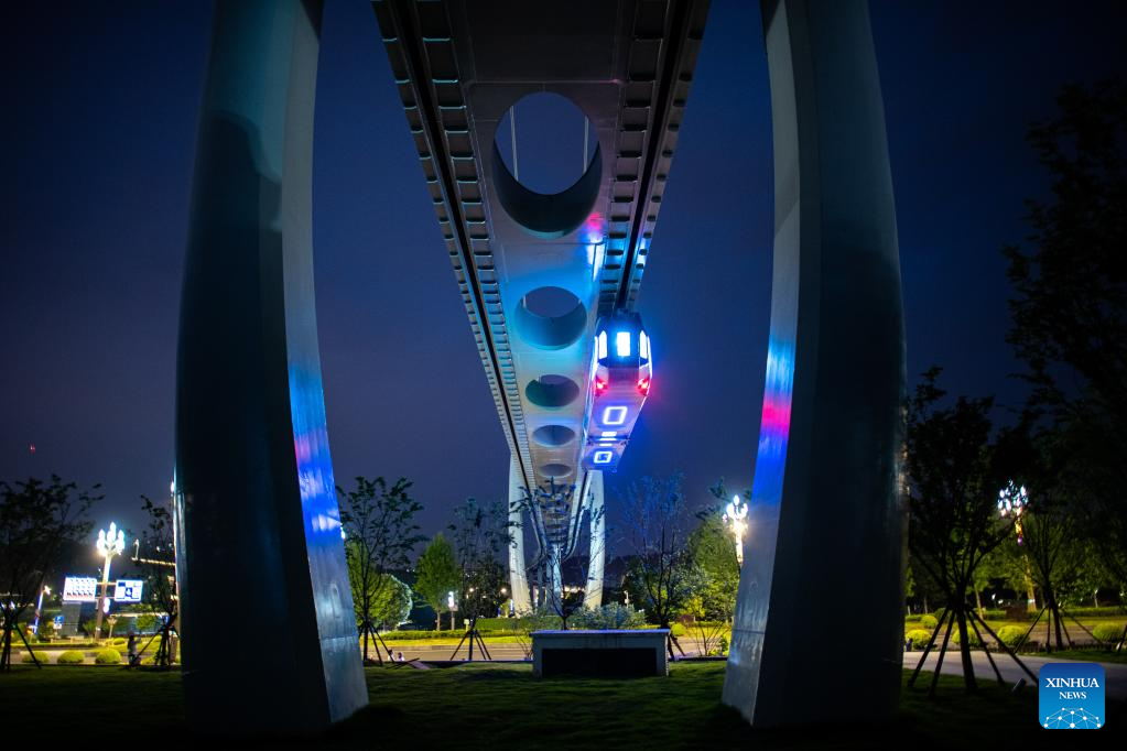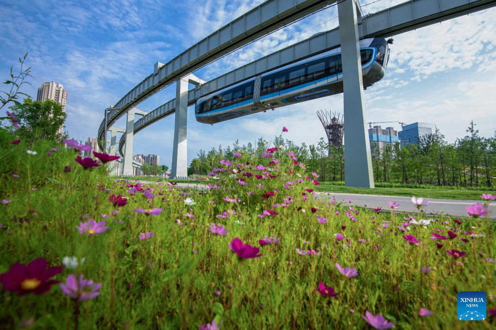This photo taken on May 9, 2023 shows a train running on the suspension monorail line in Wuhan, central China's Hubei Province. The suspension monorail line in Wuhan has undergone a running test before being put into trial operation. (Xinhua/Xiao Yijiu)