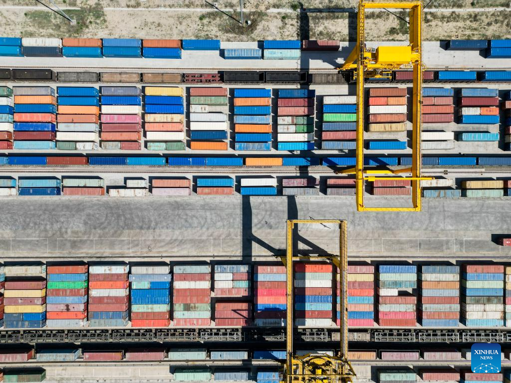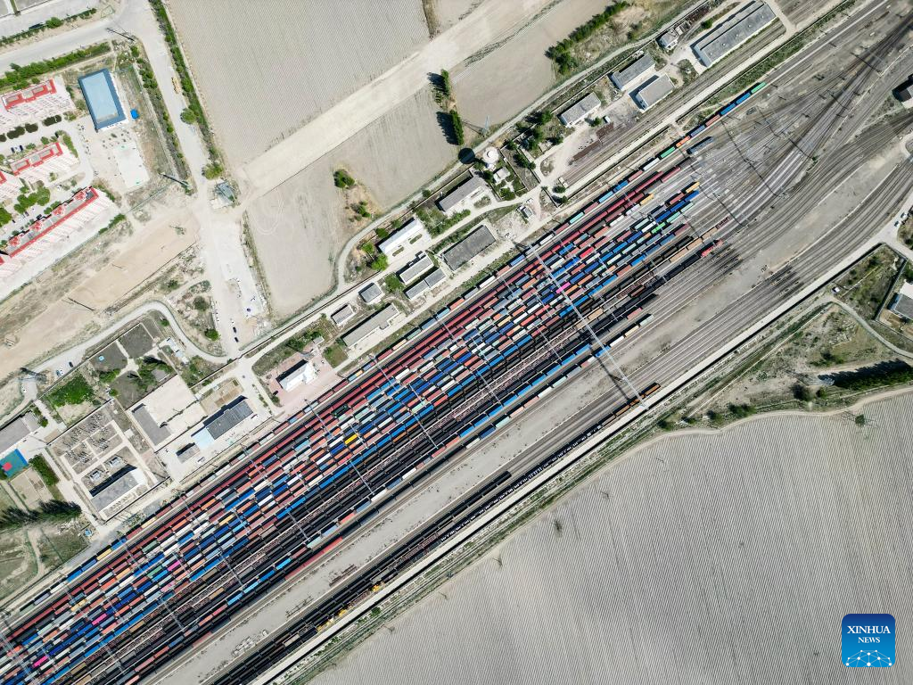 This aerial photo taken on May 11, 2023 shows a crane loading containers at a railway port in Horgos, northwest China's Xinjiang Uygur Autonomous Region. (Xinhua/Hao Zhao)