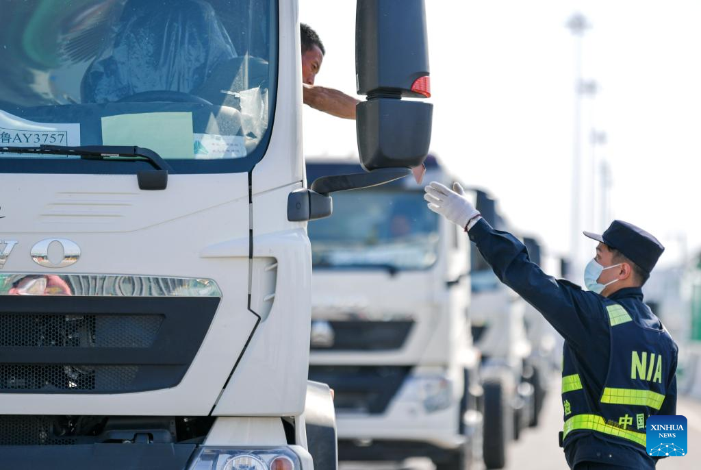 A police officer of the frontier inspection department of Horgos checks outbound commercial vehicles at a highway port in Horgos, northwest China's Xinjiang Uygur Autonomous Region, May 10, 2023. (Xinhua/Wang Fei)