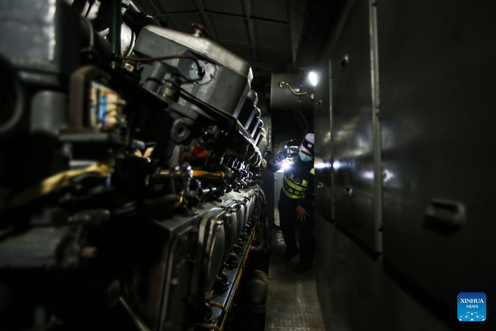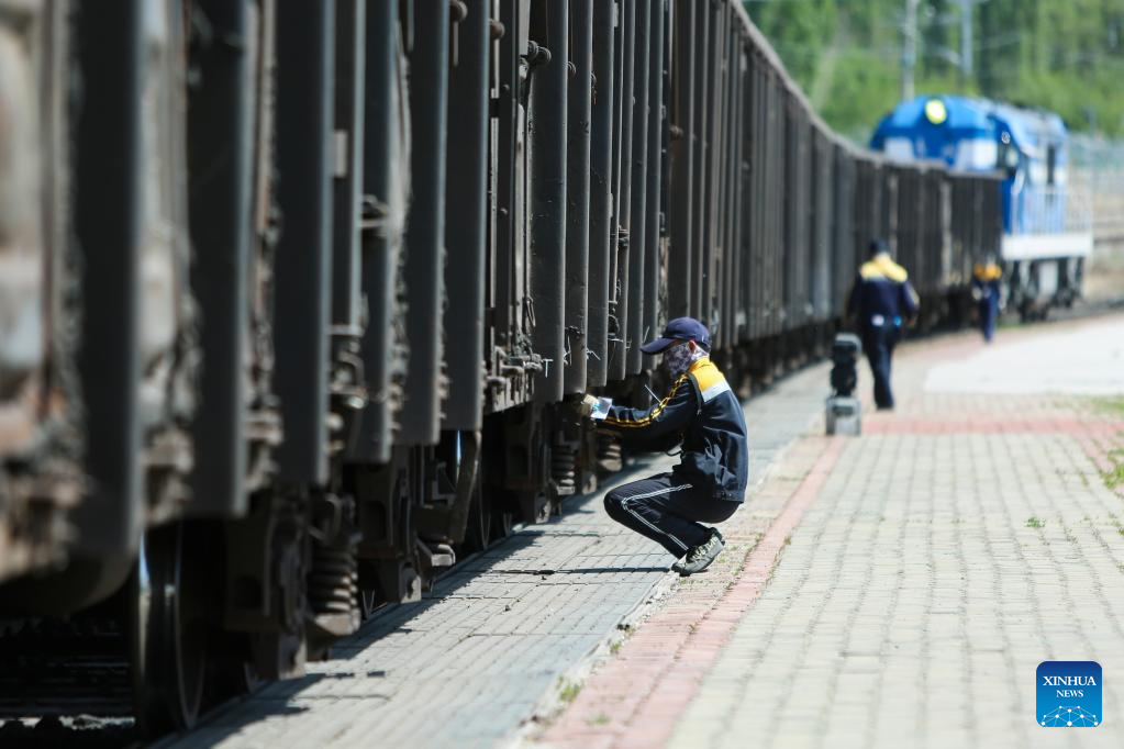 A staff member inspects a locomotive in a hump yard of a railway port in Horgos, northwest China's Xinjiang Uygur Autonomous Region, May 11, 2023. (Xinhua/Wang Fei)