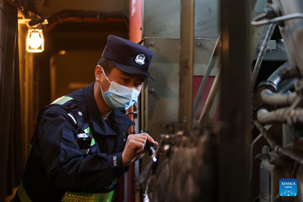 A police officer of the frontier inspection department of Horgos checks the inner conditions of an outbound train at a railway port in Horgos, northwest China's Xinjiang Uygur Autonomous Region, May 7, 2023. (Xinhua/Hao Zhao)