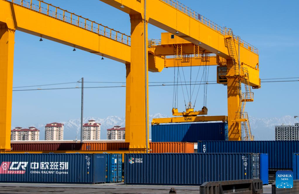 A crane loads containers at a railway port in Horgos, northwest China's Xinjiang Uygur Autonomous Region, May 11, 2023. (Xinhua/Wang Fei)