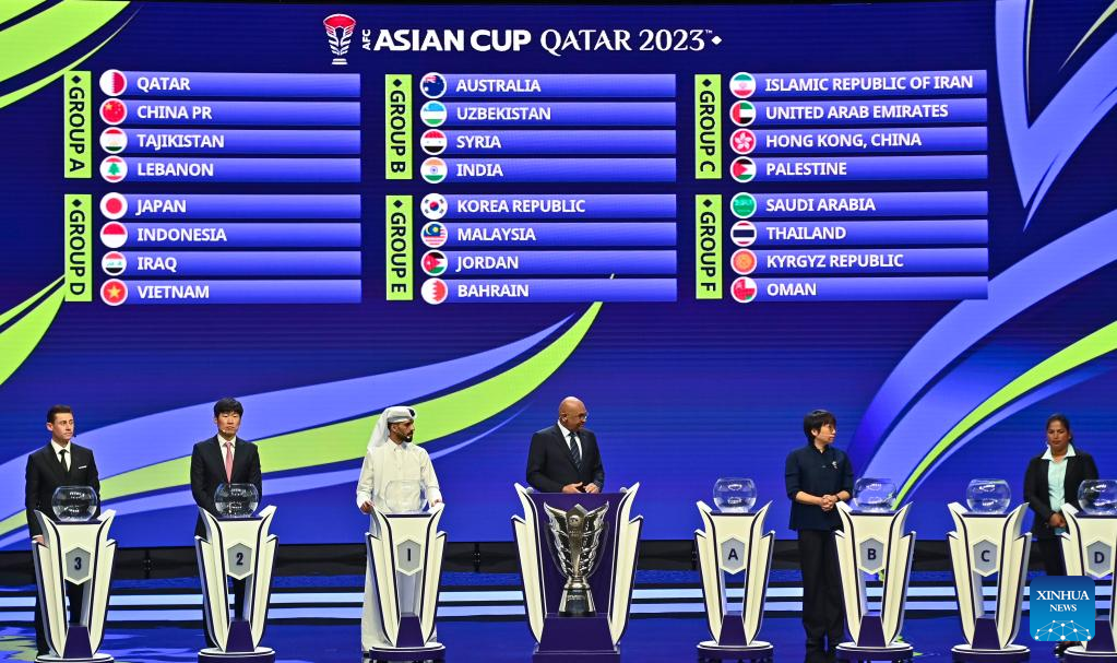 A screen displays the draw result during the draw ceremony for the 2023 AFC Asian cup championship held in Doha, Qatar on May 11, 2023. (Photo by Nikku/Xinhua)