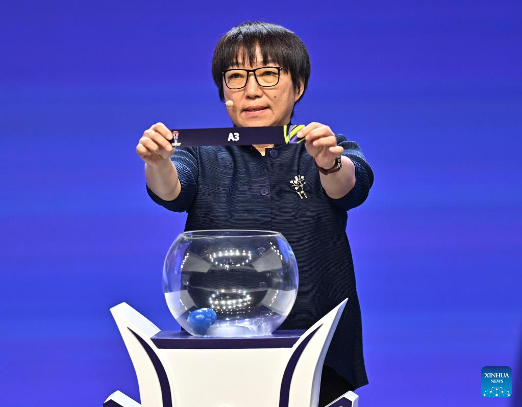 Sun Wen, vice president of the Chinese Football Association (CFA), displays the slip during the draw ceremony for the 2023 AFC Asian cup championship held in Doha, Qatar on May 11, 2023. (Photo by Nikku/Xinhua)