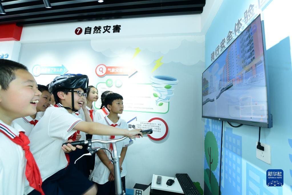 Elementary students experience cycling simulation to raise safety awareness in Shaxi Township, Taicang, east China's Jiangsu Province, May 10, 2023.?(Photo by Ji Haixin/Xinhua)
