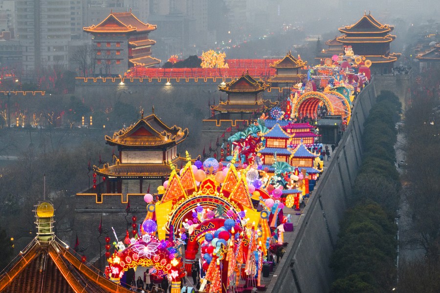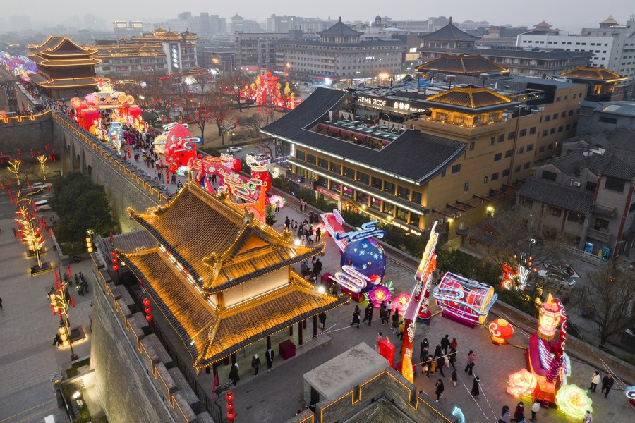 This aerial photo taken on Feb. 26, 2023 shows the south part of the ancient city wall in Xi'an, northwest China's Shaanxi Province. (Xinhua/Shao Rui)