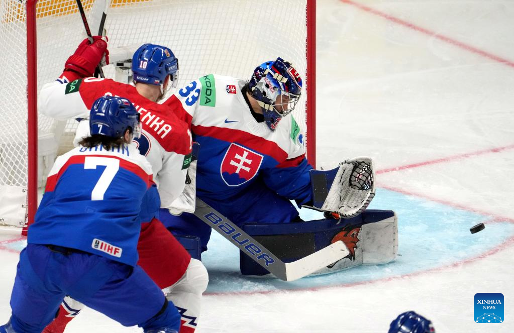 Slovakia's goalkeeper Stanislav Skorvanek (L) tries to make a save during the Group B match between the Czech Republic and Slovakia at the 2023 IIHF Ice Hockey World Championship in Riga, Latvia, May 12, 2023. (Photo by Edijs Palens/Xinhua)