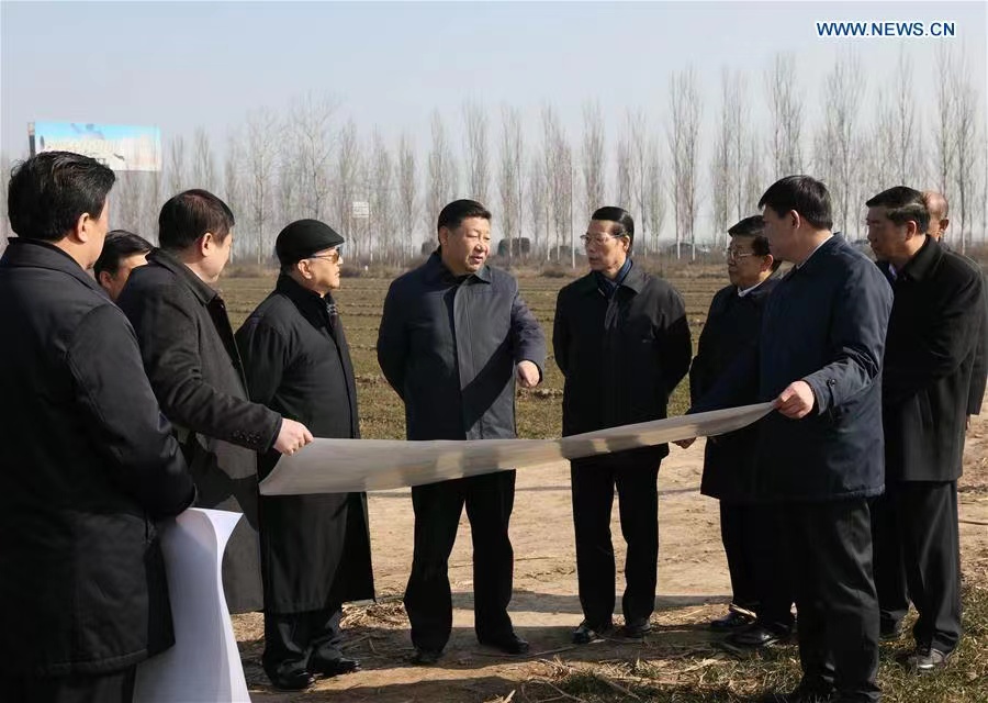 Chinese President Xi Jinping (C) inspects the Xiong'an New Area scheme in Anxin county of Baoding city, north China's Hebei province, Feb 23, 2017. (Photo by Lan Hongguang/Xinhua)