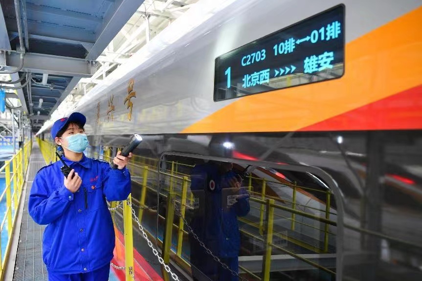 Photo taken on Dec. 27, 2021 shows a train maintenance worker examining the external electronic display screen of a Fuxing bullet train. (Photo by Sun Lijun/People's Daily Online)